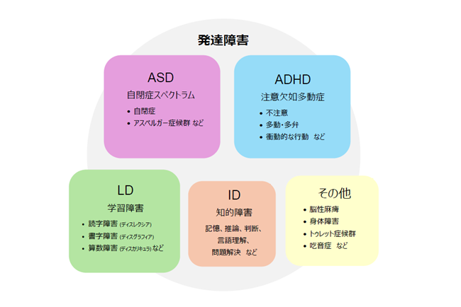 自閉症スペクトラム障害(ASD):アスペルガー症候群などを含み、社会性やコミュニケーションに特徴がある。